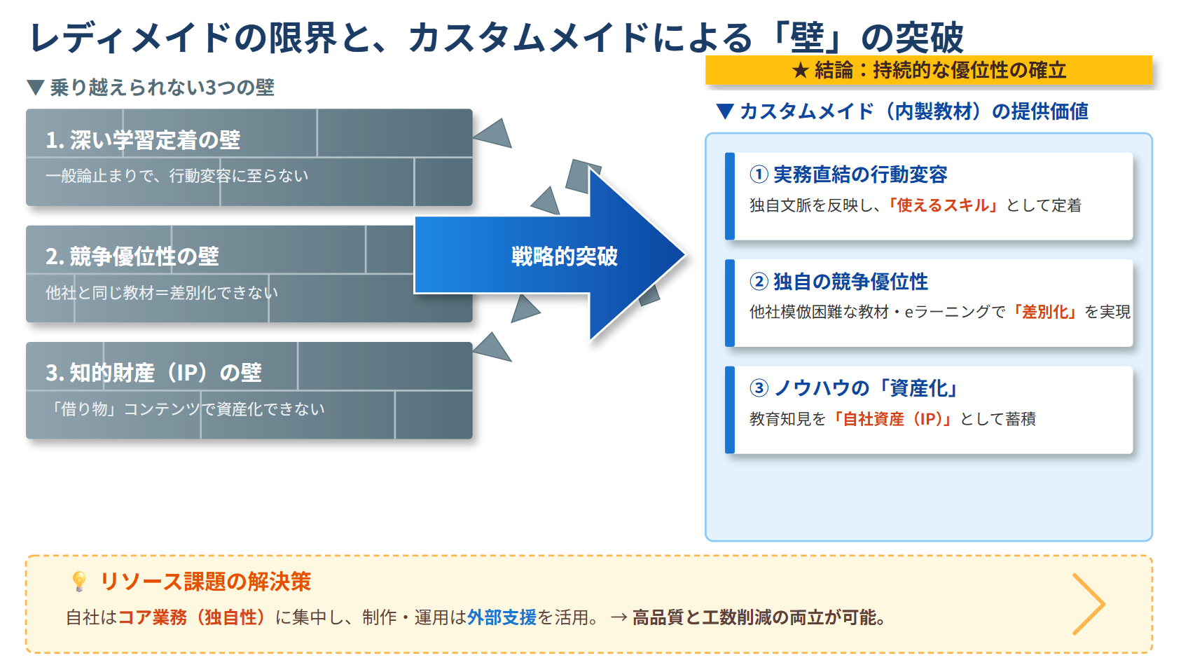 迅速性や初期コストの低さといった利点を持つレディメイドコンテンツ(汎用教材)ですが、自社の教育ビジネス・研修事業の根幹において、「越えられない壁」が存在します。それらがどのような壁なのか挙げてみました。