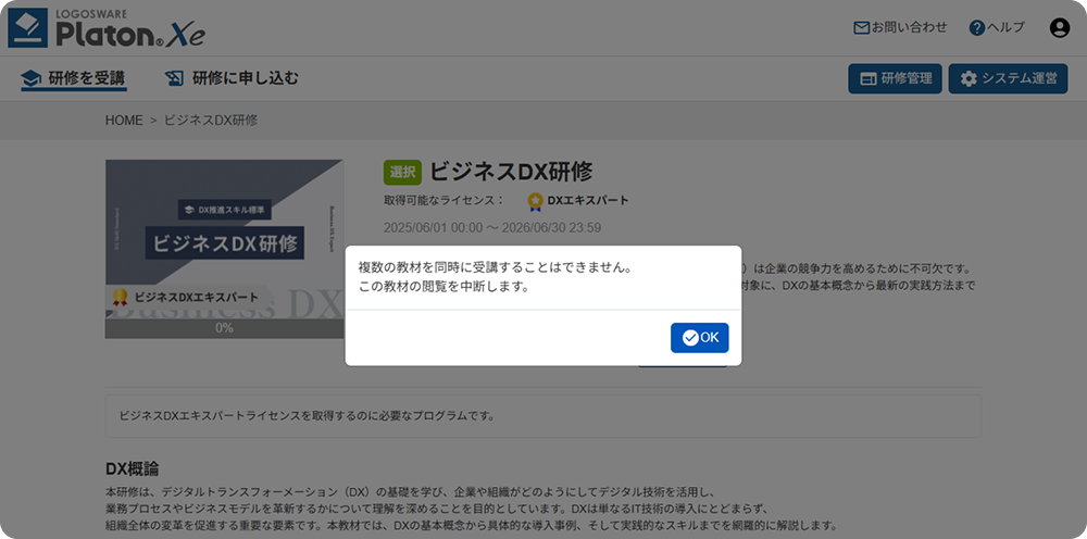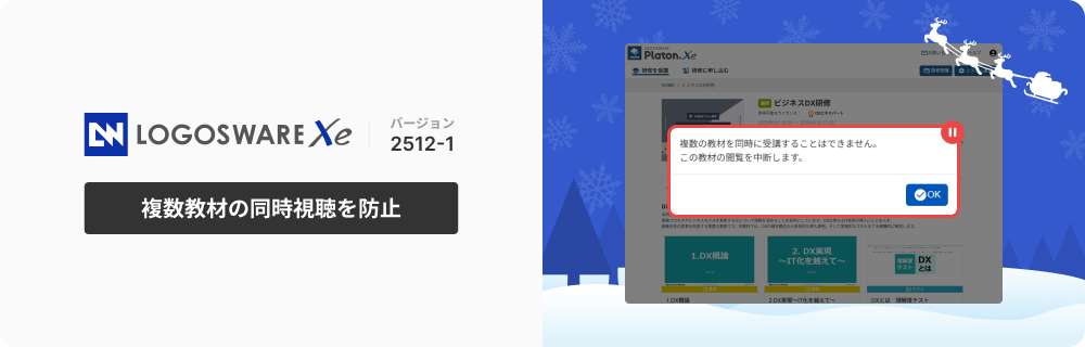• 学習者がブラウザの「別タブ」や「別ウィンドウ」を開いて、同時に複数の教材を再生しようとすると、システムが検知してアラートを表示する機能を追加しました。これにより、助成金申請時などに求められる厳密な学習時間の記録が可能になります。