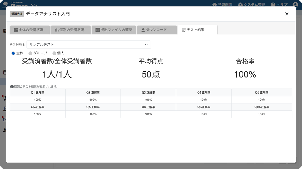 • テスト結果(THiNQテスト)を、従来のCSVダウンロードに加え、研修管理画面上で直接表示できるようになりました。これにより、よりスピーディーに学習状況の把握が可能になります。